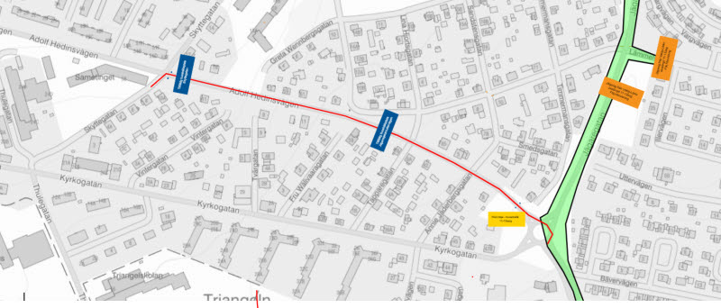 Karta över Jägaregatan/Adolf Hedinsvägen. Blå boxar markerar tillfällga hållplatser.