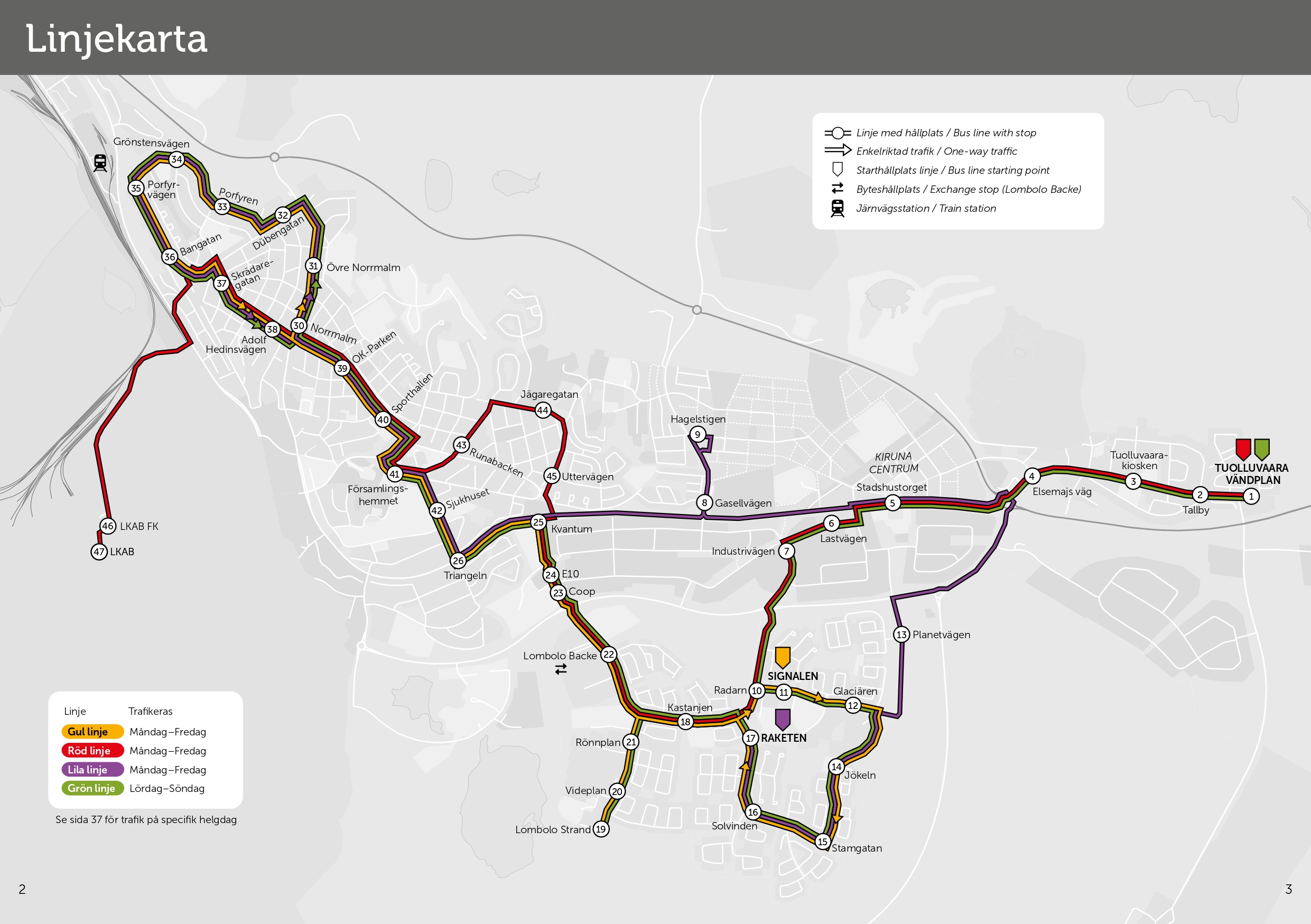 Tuolluvaara – Stadshustorget – Lastvägen – Signalen – Solvinden – Lombolo Strand – Lombolo Backe – Coop – Sjukhuset – Sporthallen – Norrmalm – Porfyren – Sporthallen – Sjukhuset – Coop – Lombolo Backe – Lombolo Strand – Solvinden – Signalen – Lastvägen – Stadshustorget – Tuolluvaara.